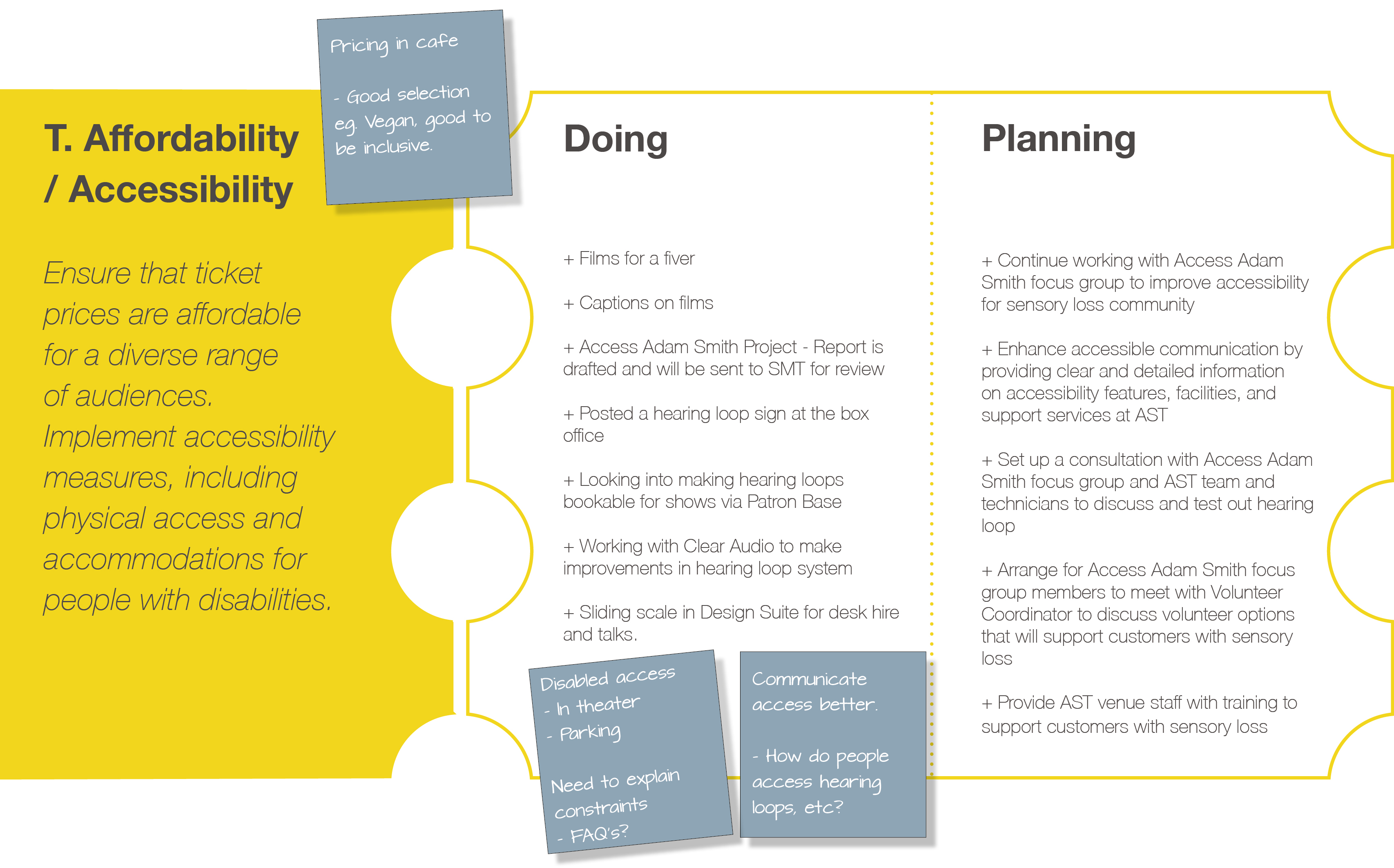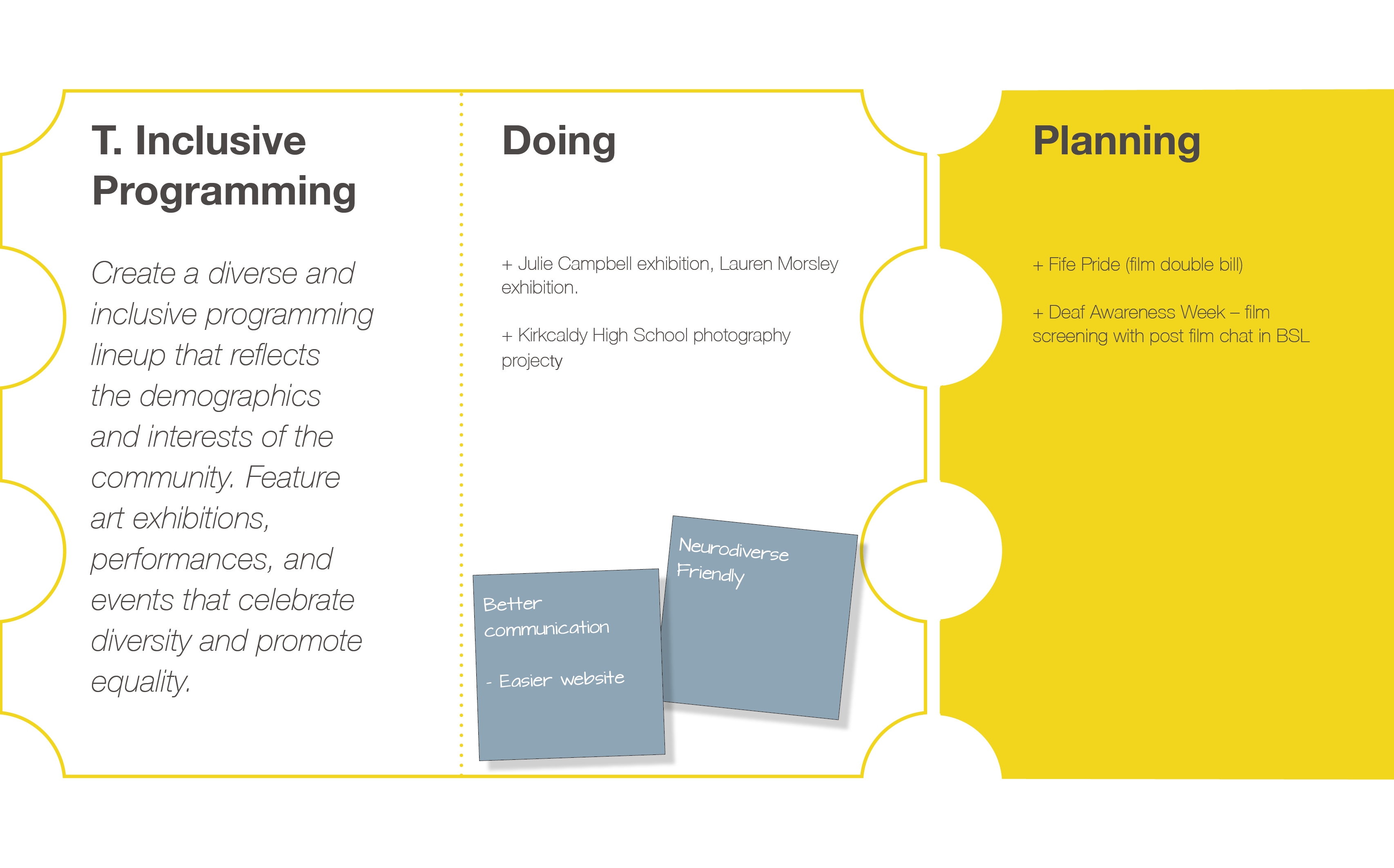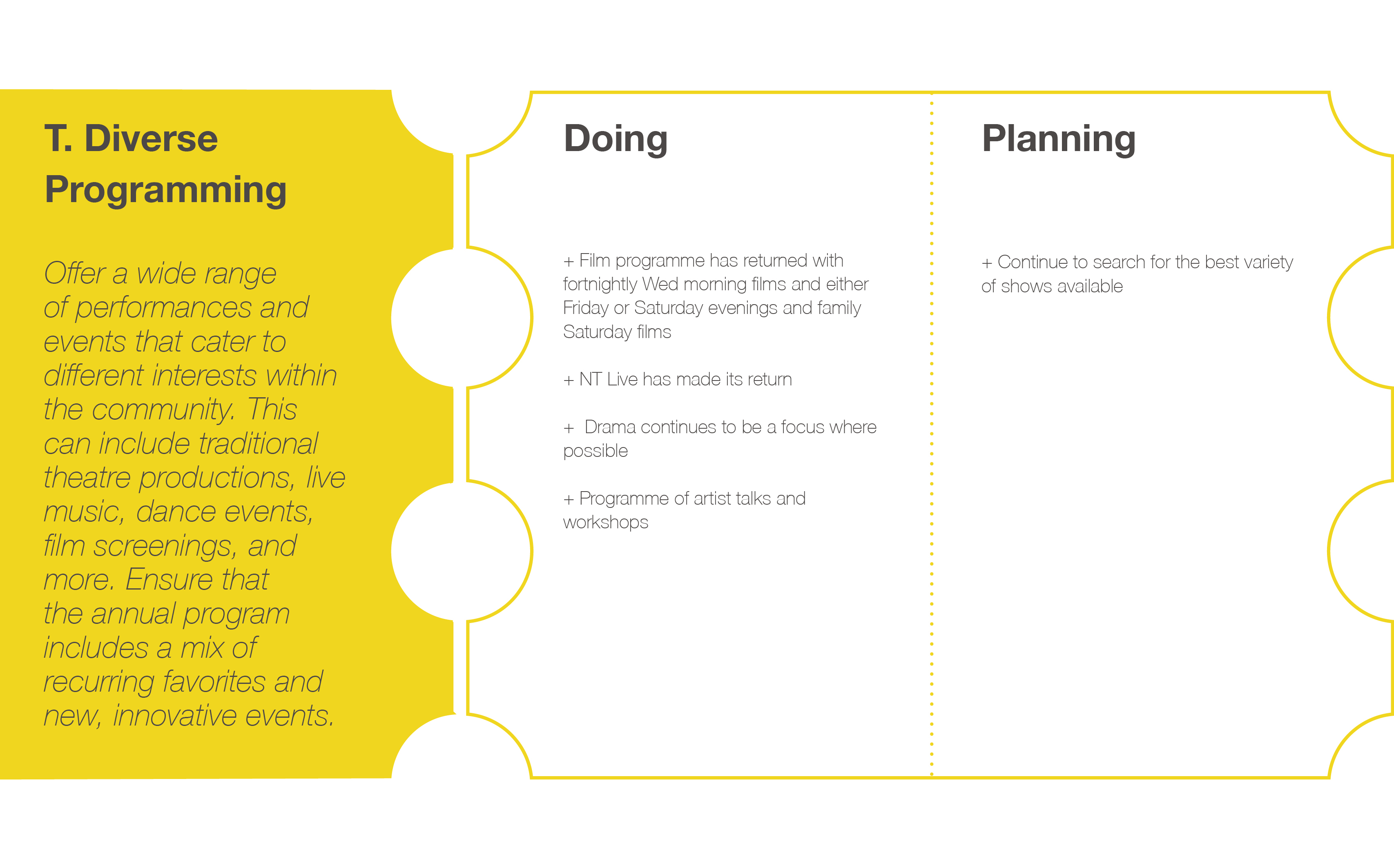 • Create a relevant, welcoming, and inclusive place: Ensure the theatre reflects the diverse community it serves.