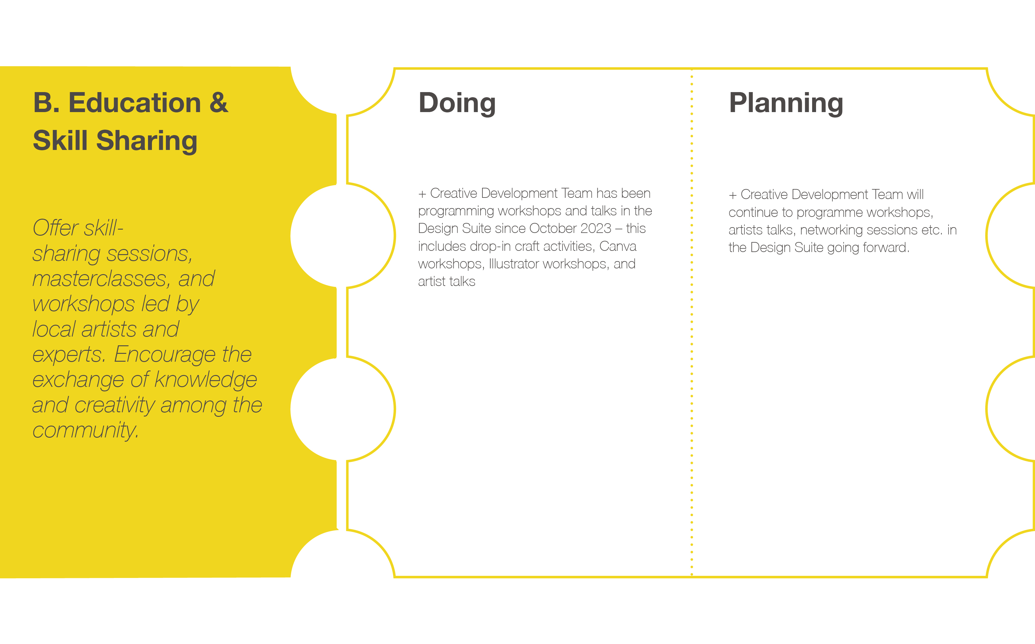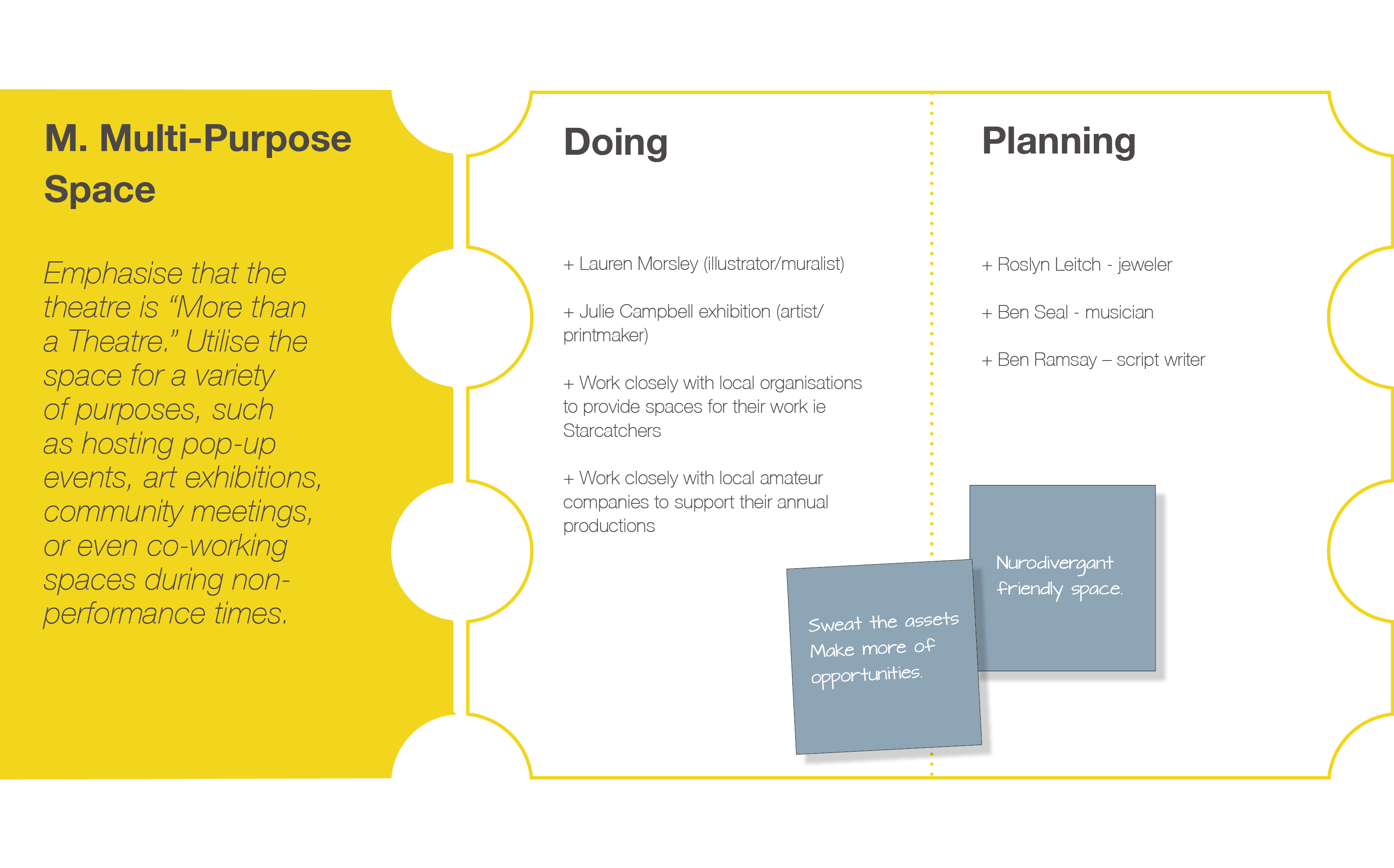 The feedback and suggestions were enthusiastically received during the Review workshop, affirming the participants’ priorities. No significant changes were needed, confirming the community’s shared vision for the theatre’s future.