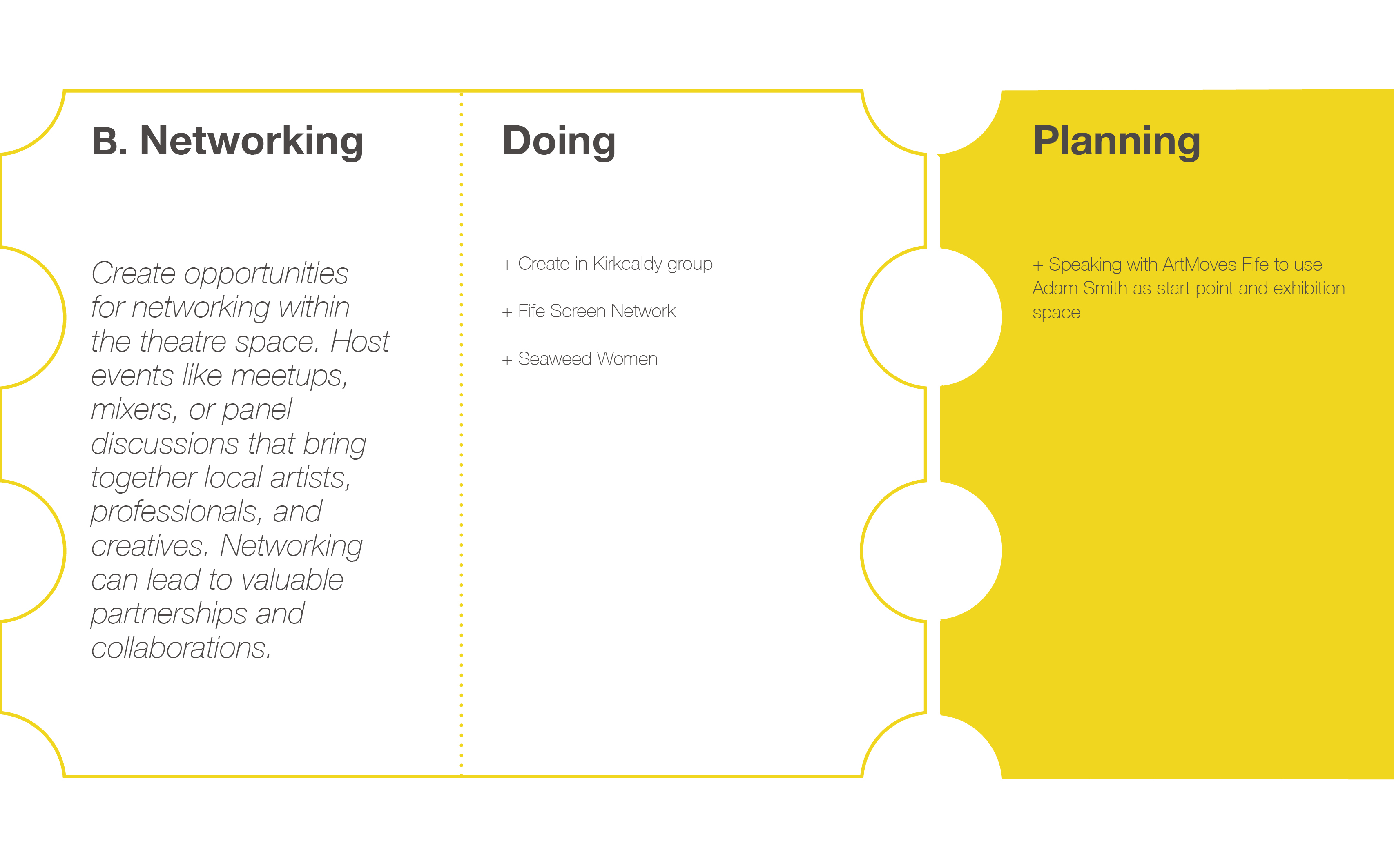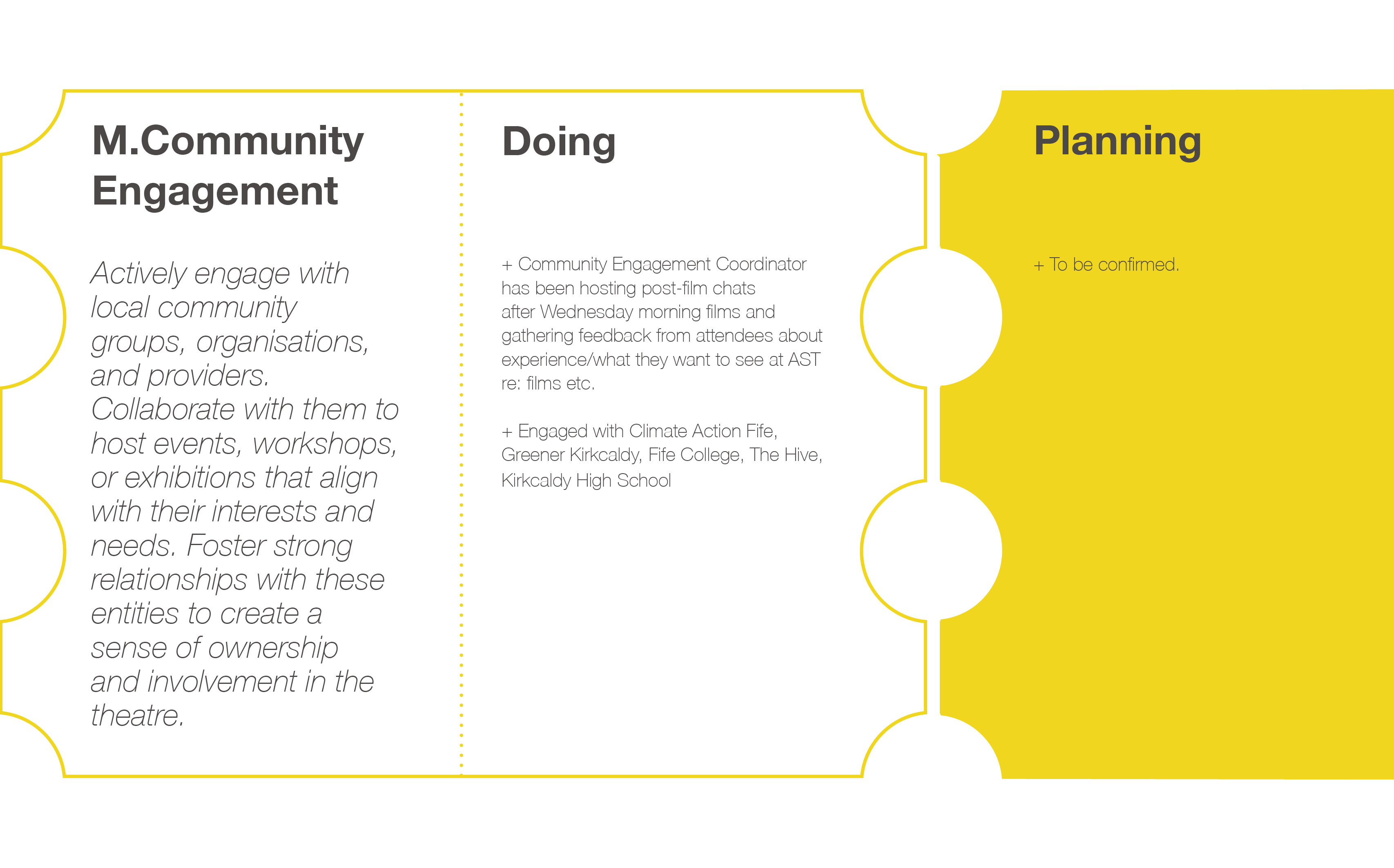Through community engagement, we’ll not only offer desired programmes, but also build strong connections with local businesses, enhancing Kirkcaldy as a whole. We’re dedicated to celebrating arts in every form, fostering creativity, nurturing inspiration, and championing inclusivity.